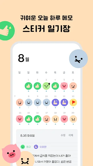 - 귀여운 스티커를 붙여 기분, 수면, 배변, 생리 등 다양한 주제로 간편하게 하루를 기록해 보세요.