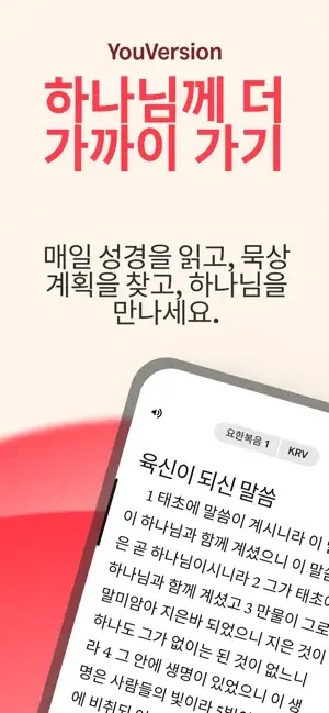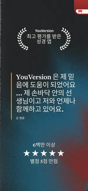 수백 가지 언어로 된 775개 이상의 성경 번역본 중에서 선택하세요.* 인기있는 번역본인 개역한글, 새번역, 현대인의 성경, NIV, NASB, ESV, NKJV, NLT, KJV, The Message 등을 선택할 수 있습니다. * 오프라인 성경: 네트워크 연결 없이 성경을 읽을 수 있습니다(일부번역본만 가능).* 오디오 성경으로 말씀을 들으며 건너뛰기, 다시듣기, 속도 및 타이머 조정 기능을 사용해 보세요. (오디오 성경은 일부 번역본에서만 지원하며 다운로드가 불가함).