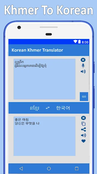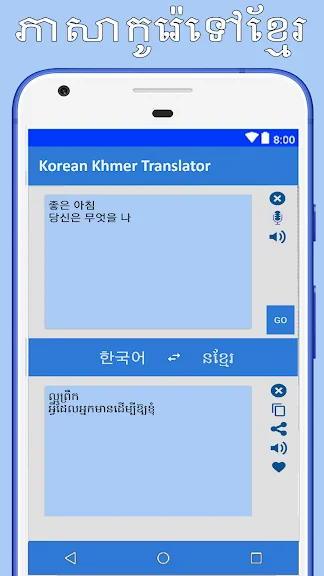 Text to speech feature - Translate Korean to Khmer has a unique speaking feature in it. user can use it by tapping text to speech feature on app and speak Korean to Khmer words or sentences which user want to translate into Khmer.