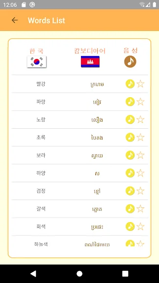 Korean Khmer Dictionary – travel dictionary to Translate Korean to Khmer displaying a list of words in Khmer.