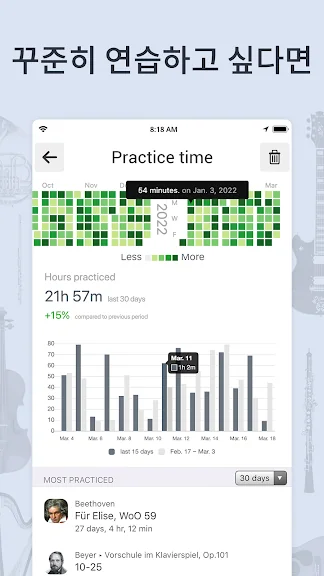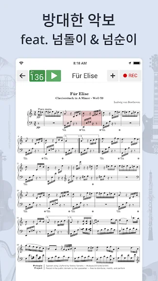 • 앱을 통해 악보를 업로드할 수 있습니다. 업로드 된 악보를 보면서 녹음하고 메트로놈과 함께 연습할 수 있습니다.