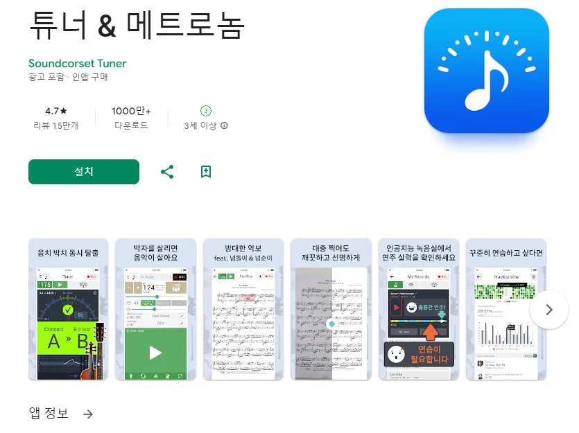 이 어플은 구글플레이스토어에서 "기타 튜닝"로 검색했을때 3번째로 나오는 어플입니다. 아래는 튜너 & 메트로놈 어플에 대한 자세한 설명이니 참고하세요.