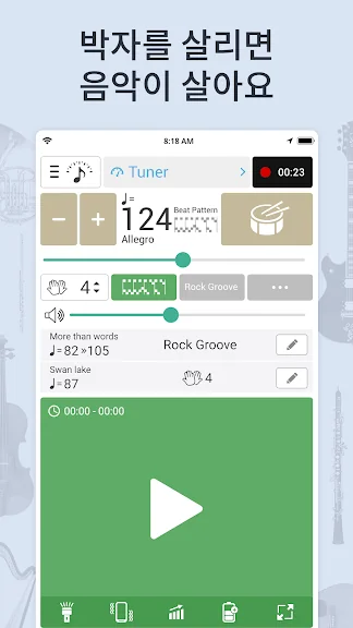 • 메트로놈: 모든 타이밍 설정, 메트로놈 비트 변경, 원하는 속도 맞춤 선택