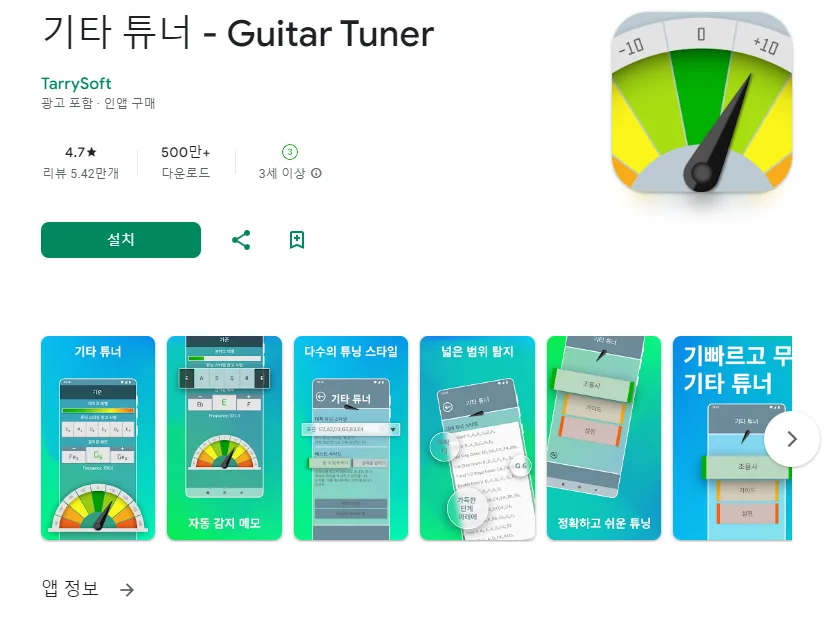 이 어플은 구글플레이스토어에서 "기타 튜닝"로 검색했을때 1번째로 나오는 어플입니다. 아래는 GuitarTuna: 기타 조율 튜너 어플에 대한 자세한 설명이니 참고하세요.