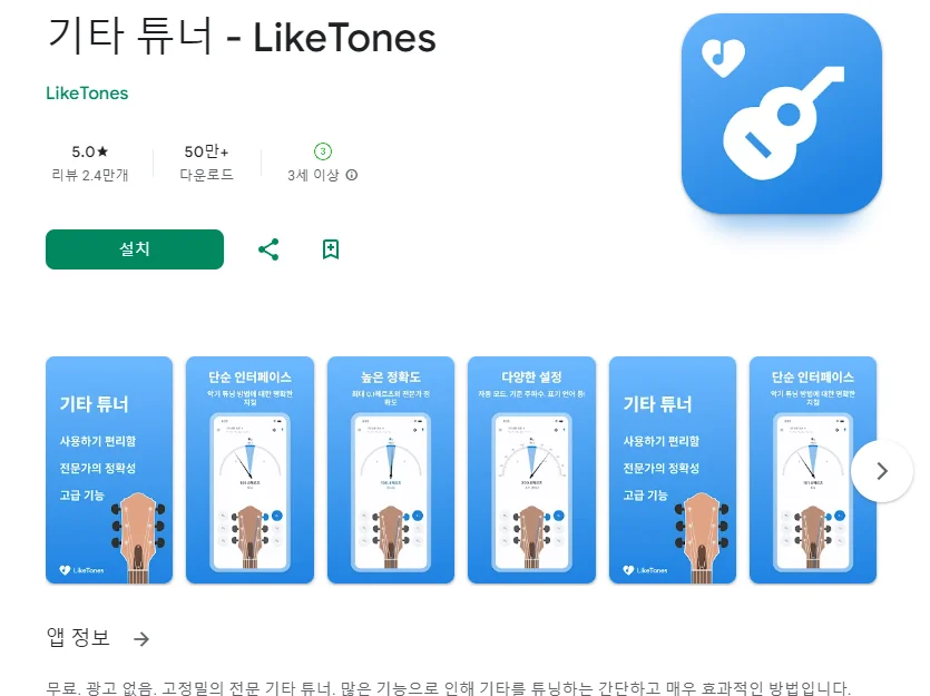 이 어플은 구글플레이스토어에서 "기타 튜닝"로 검색했을때 2번째로 나오는 어플입니다. 아래는 기타 튜너 - LikeTones 어플에 대한 자세한 설명이니 참고하세요.
