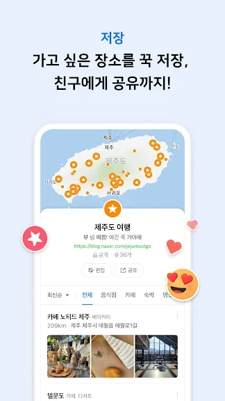 더 많은 맛집과 여행 스팟 등 관심 장소를 지도위에 쉽게 저장하고, 친구들과 편하게 공유할 수 있어요.