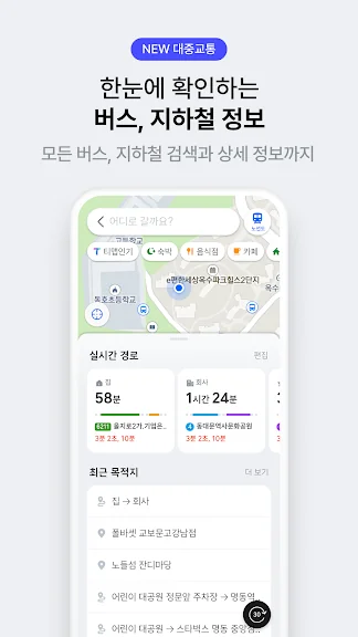 자동차/대중교통/도보/자전거 무엇을 이용하든 24시간 내에 업데이트 된 최신정보로 안내해요