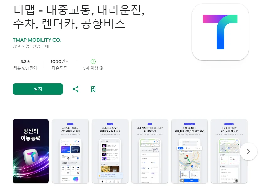 아래는 티맵 - 대중교통, 대리운전, 주차, 렌터카, 공항버스 어플에 대한 스크린샷 정보입니다.