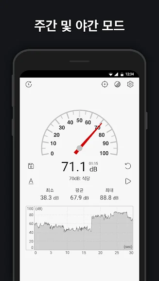 소음측정기 (Sound Meter) 어플에 대한 스크린샷 정보가 필요하시다면 아래 이미지를 참고하시기 바랍니다.