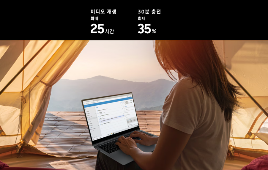 갤럭시 북4 프로 360은 76Wh의 대용량 배터리를 장착하여, 최대 약 15시간까지 사용할 수 있습니다. 이는 장시간 외부 활동이나 출장 시 유용하며, 고속 충전을 지원해 짧은 시간에도 배터리를 충분히 채울 수 있습니다. 배터리 효율을 높이는 설계 덕분에 사용자가 필요에 따라 배터리를 절약할 수 있으며, 장시간 사용 시에도 안정적인 성능을 제공합니다.