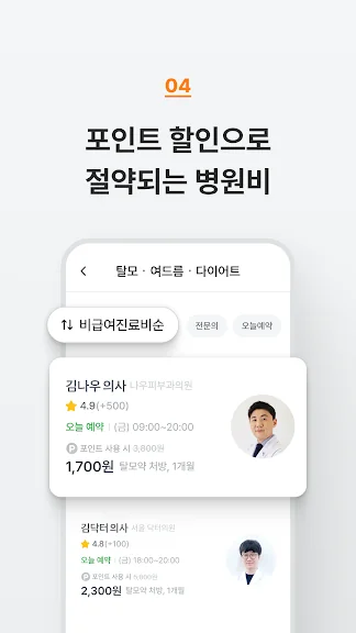 - 닥터포인트로 병원비 아끼기: 돈 버는 만보기로 매일 포인트를 쌓을 수 있고, 언제든 비급여 진료비에 사용해 보세요. 탈모, 다이어트, 여드름, 사후피임 등 다양한 진료 시에 사용할 수 있어요.