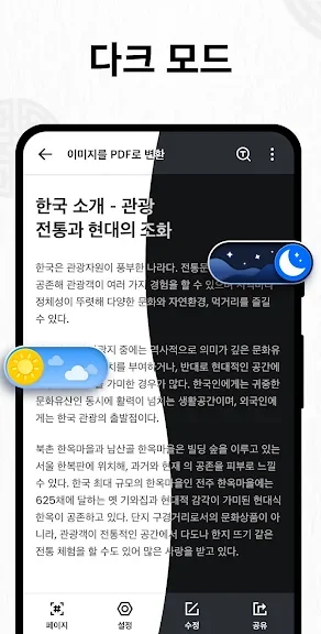 특히 PDF 변환 기능은 이미지나 문서를 PDF로 바꾸는 작업을 간편하게 처리해 주며, 전자 서명이나 비밀번호 보호 기능도 제공해 보안과 실용성을 모두 갖추었습니다. 또한 다크 모드와 페이지 확대 기능으로 사용자 경험을 더욱 편리하게 제공합니다.