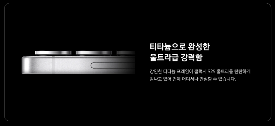 갤럭시 S25 울트라는 티타늄 프레임을 채택하여 세련미와 내구성을 동시에 제공합니다. 이 티타늄 프레임은 기기의 견고함을 강화하며, 스타일리시한 외관을 유지합니다. 컬러 라인업도 티타늄 실버블루, 티타늄 화이트실버, 티타늄 그레이, 티타늄 블랙 등 다양한 선택지를 제공합니다. 이는 사용자에게 개성을 표현할 수 있는 기회를 제공하며, 국가 및 통신사에 따라 다르게 제공됩니다.