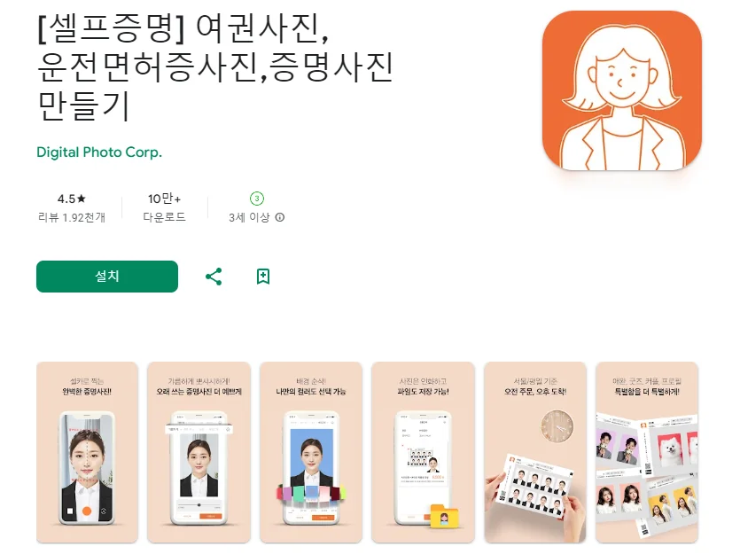 이 어플은 구글플레이스토어에서 "셀프 증명사진"로 검색했을때 1번째로 나오는 어플입니다. 아래는 증명사진 애플리케이션 어플에 대한 자세한 설명이니 참고하세요.