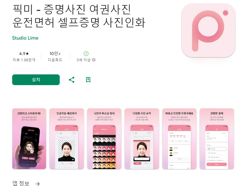 아래는 증명사진 애플리케이션 어플에 대한 스크린샷 정보입니다.