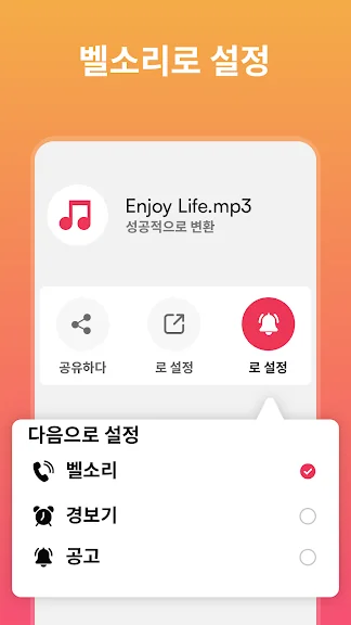 - MP3 파일을 벨소리/알림음 및 알람음으로 빠르게 변환한 후 설정을 지원합니다.