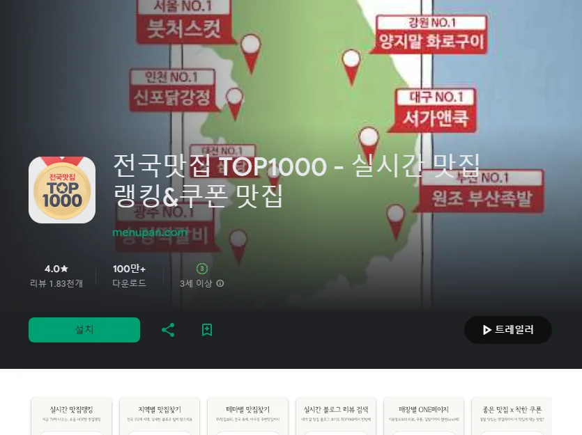 이 어플은 구글플레이스토어에서 "전국 맛집 지도"로 검색했을때 1번째로 나오는 어플입니다. 아래는 전국맛집 TOP1000 - 실시간 맛집 랭킹&쿠폰 맛집 어플에 대한 자세한 설명이니 참고하세요.