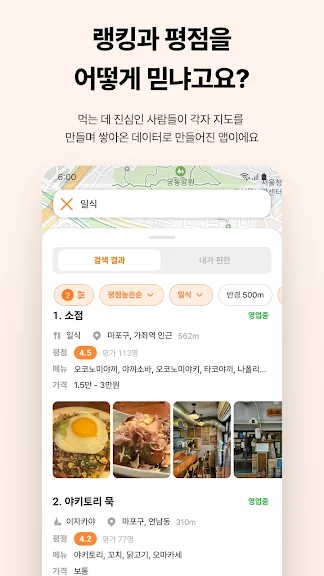 위치기반 시스템으로 업로드되기 때문에 유저가 직접 방문한 맛집 사진들이 올라옵니다. 광고 없는 '내돈내산' 맛집 어플입니다.