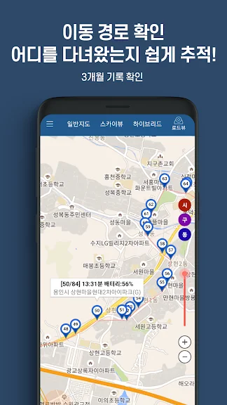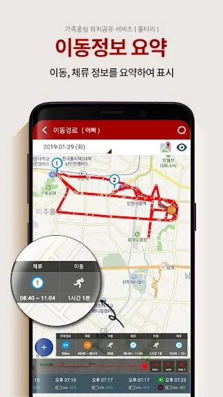 이동 경로를 기록하여 지도상에서 이동 방향과 상세 이동 경로를 조회할 수 있으며 언제 어느 위치에서 얼마나 체류하였는지 활동 정보를 요약해서 표시해 줍니다.