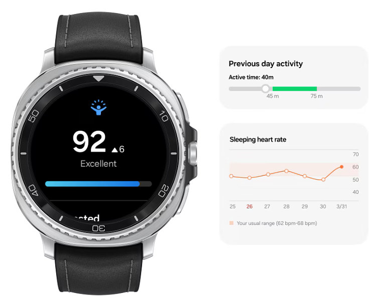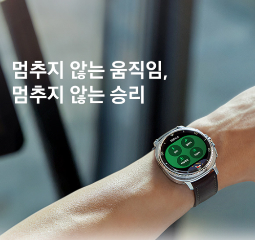 이 모델은 야외 환경에서도 뛰어난 시인성을 자랑합니다. 최대 3,000니트의 고휘도 디스플레이가 적용되어 햇빛이 강한 한낮에도 화면을 또렷하게 볼 수 있으며, 디스플레이 품질 자체도 매우 뛰어나 다양한 정보를 선명하게 표현해줍니다. 여기에 새롭게 적용된 One UI 8 워치 인터페이스는 더욱 직관적인 조작을 가능하게 만들어줍니다. 간단한 손동작만으로도 자주 사용하는 앱에 빠르게 접근할 수 있으며, ‘나우 바’와 ‘멀티 인포 타일’ 같은 기능을 통해 다양한 정보를 한눈에 확인할 수 있어 효율적인 사용이 가능합니다.