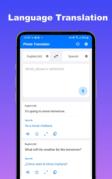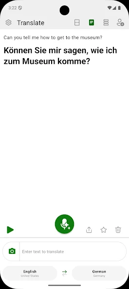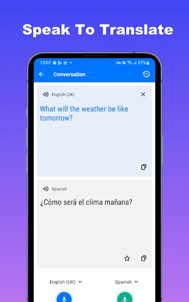5. 음성 입력 및 출력: 앱에 직접 말하고 원하는 언어로 즉시 번역을 받으세요. 대화 기술을 향상시키고 쉽게 발음을 연습하세요. 우리의 앱은 또한 정확한 의사소통을 보장하기 위해 번역을 읽을 것입니다.