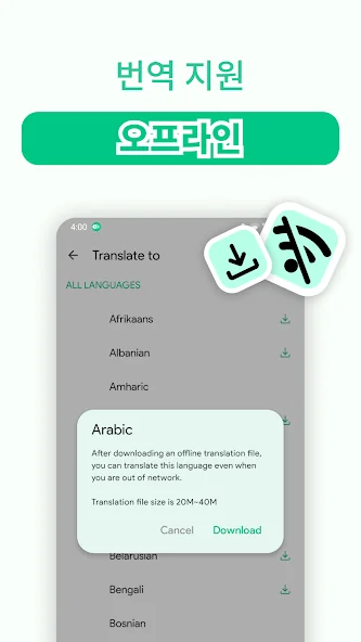 • 오프라인: 인터넷 연결 없이 번역(59개 언어)