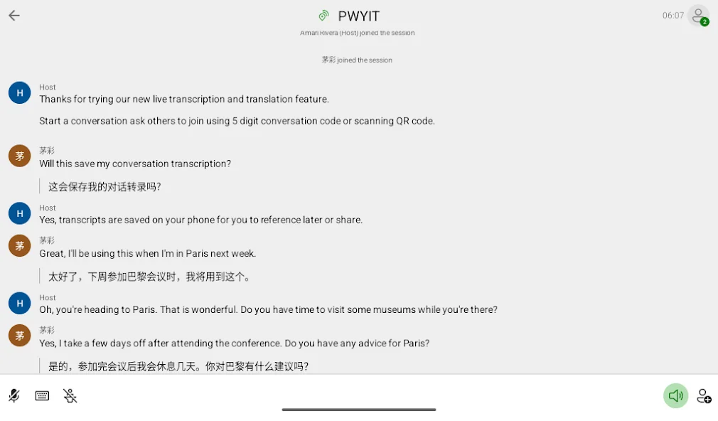 • 음성 번역 모드 지원. 참여자 두 명이 서로 다른 2개의 언어로 대화할 때, 분할 스크린 모드 지원