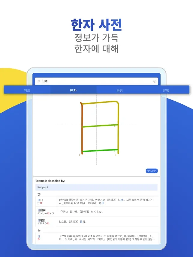 또한, 일본어와 한국어를 자유롭게 검색하거나, 로마자, 히라가나, 한자까지 폭넓게 학습할 수 있는 기능도 갖추고 있어요. 문법 설명이나 한자 쓰기 연습도 가능해서, 꾸준히 공부하는 데 유용하답니다.