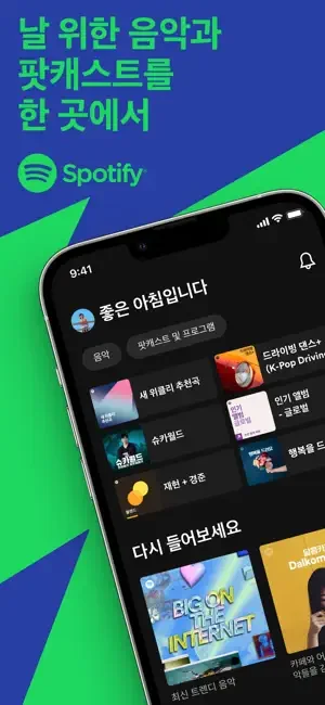 글로벌 음악 앱 Spotify로 전세계 수천만 곡의 노래를 감상하고, 나만을 위해 만들어진 플레이리스트부터 팟캐스트까지 즐겨보세요. 스트리밍부터 다운로드까지 가능한 다양한 요금제가 준비되어 있습니다.