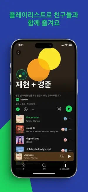 Spotify는 음악을 더 편리하게 스트리밍할 수 있도록 다른 음악 앱에서는 찾아볼 수 없는 선별된 플레이리스트를 제공합니다. 새로운 아티스트의 음악을 발견하고, 좋아하는 앨범이나 플레이리스트를 스트리밍하고, 듣고 싶은 음악을 감상하세요.